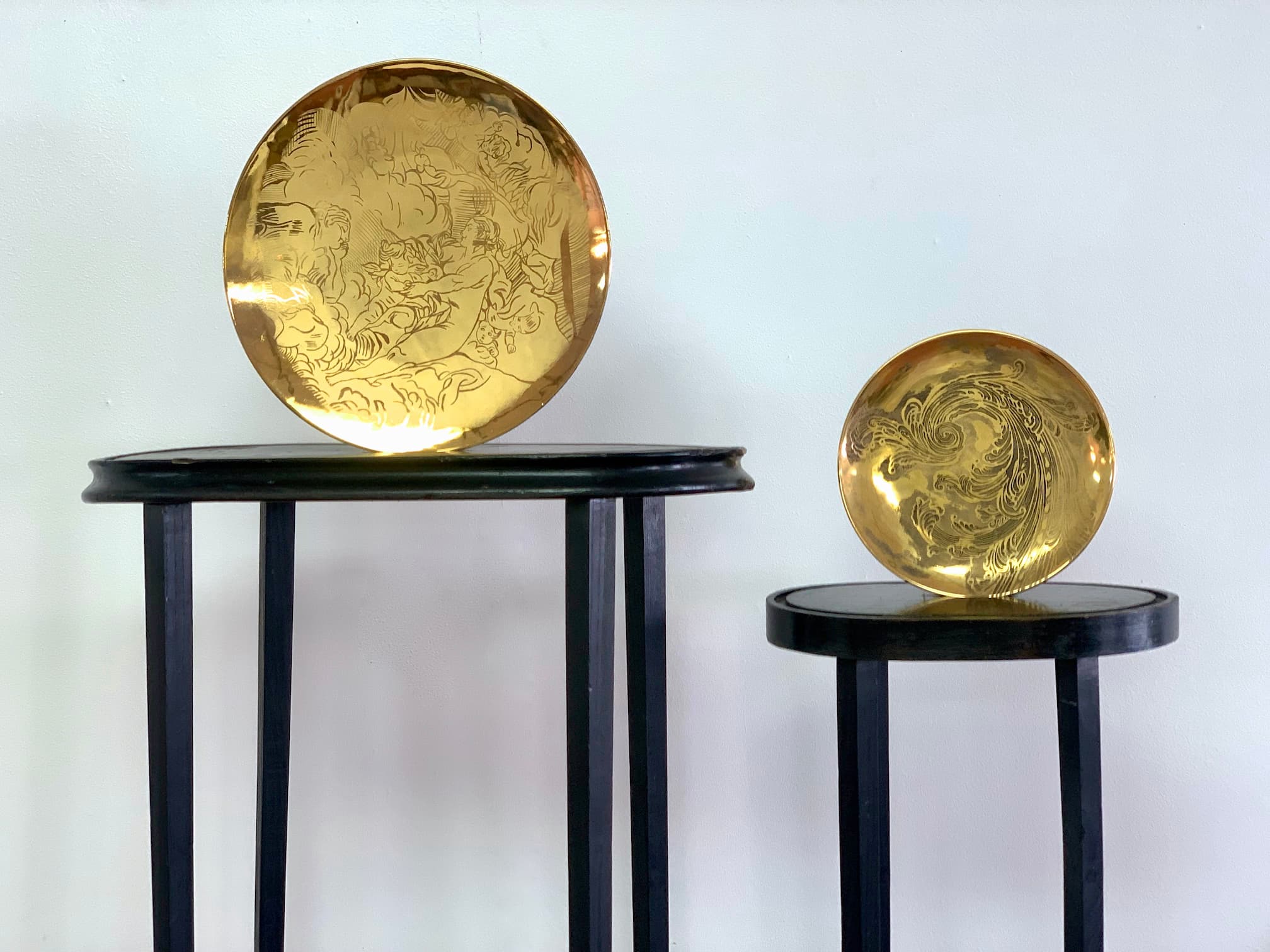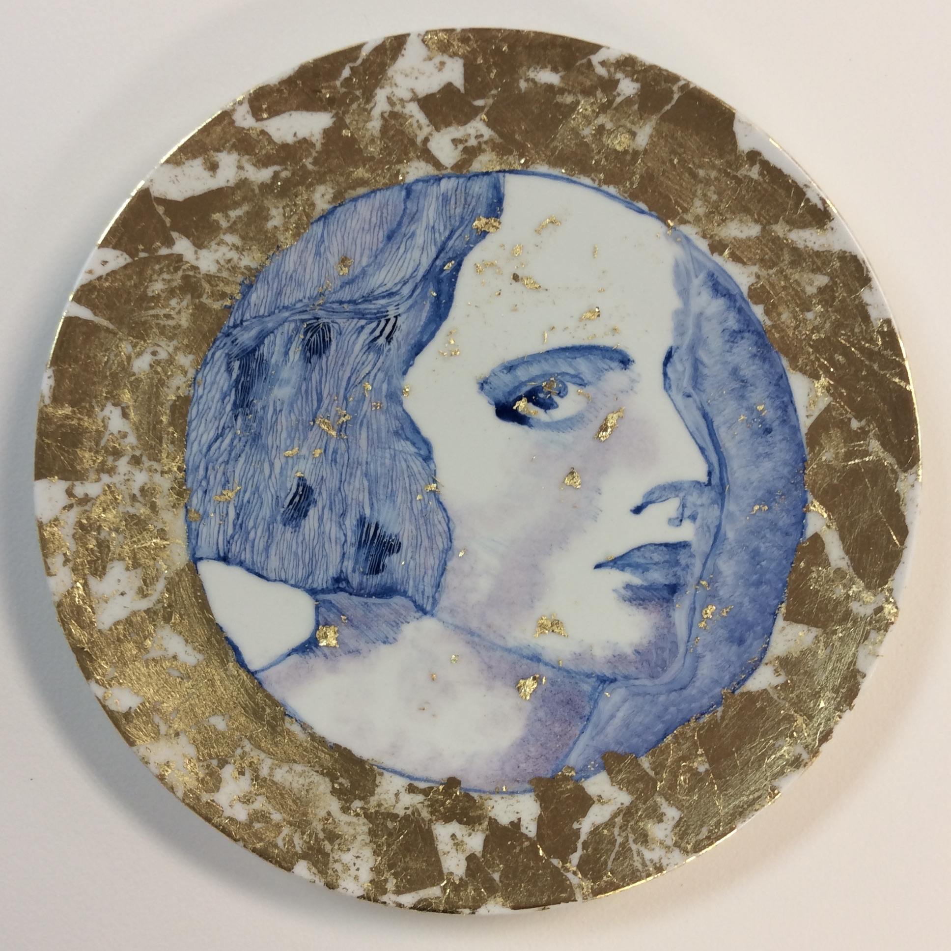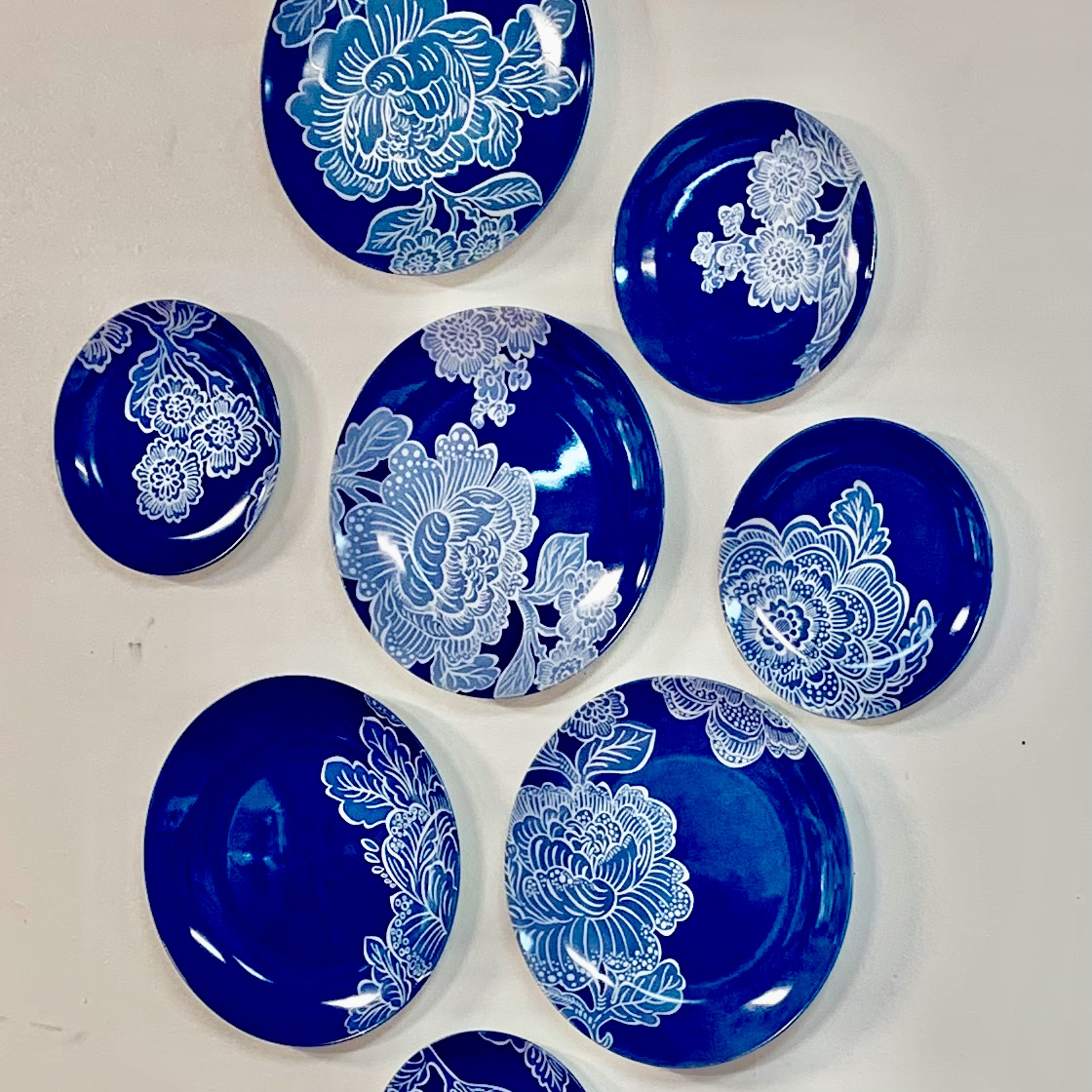 Cette installation comprend, sept porcelaines de 27cm & deux de 22cm peintes à la main et dorées à la feuille & six porcelaines de 22cm dorées à la feuille.